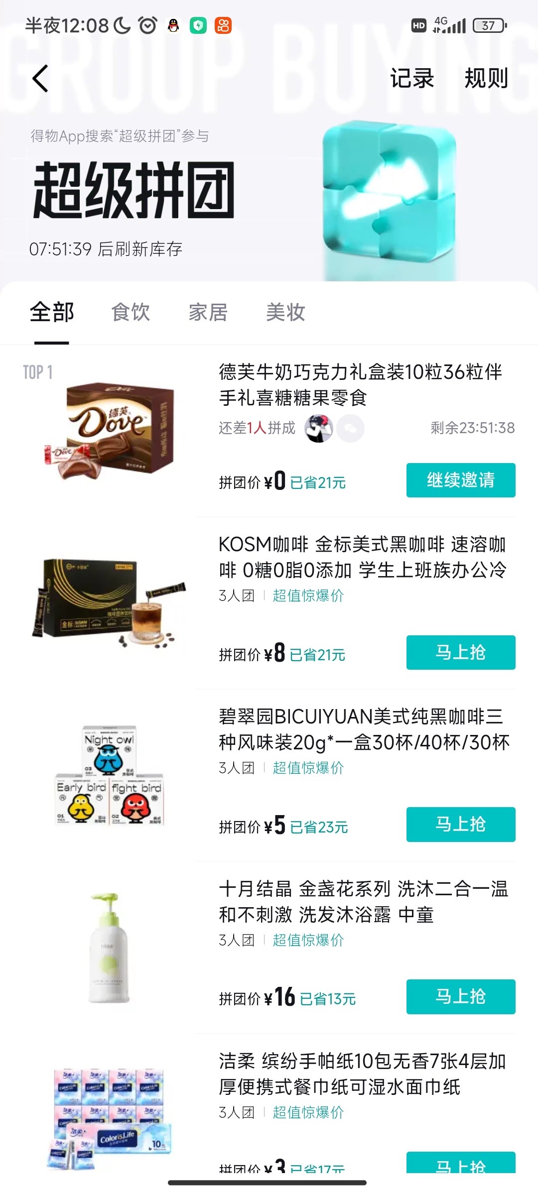 首先拿一个没注册过得物的手机号注册,不用实名直接去首页搜索超级拼团,然后第1个就是巧克力,点进去,然后分享一下自己的那个助力连接分享的微信哪里都行,然后复制一下 然后再登录自己得物的老号助力 我测试过了新号助力不了,只能老号助力