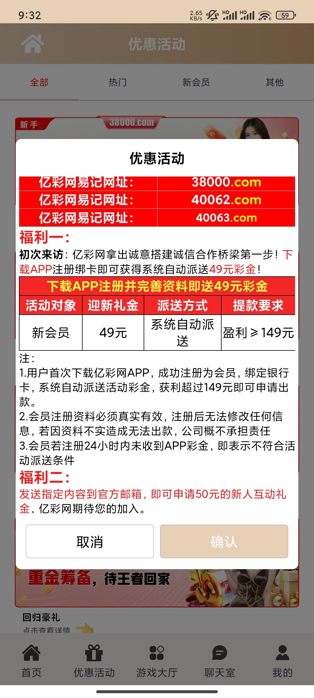 注册绑卡,系统自己送49,10分钟左右到。盈利149可以提,按提示发邮件有机会再得50彩金。我没打出来,到账自测,不要充值38000.com