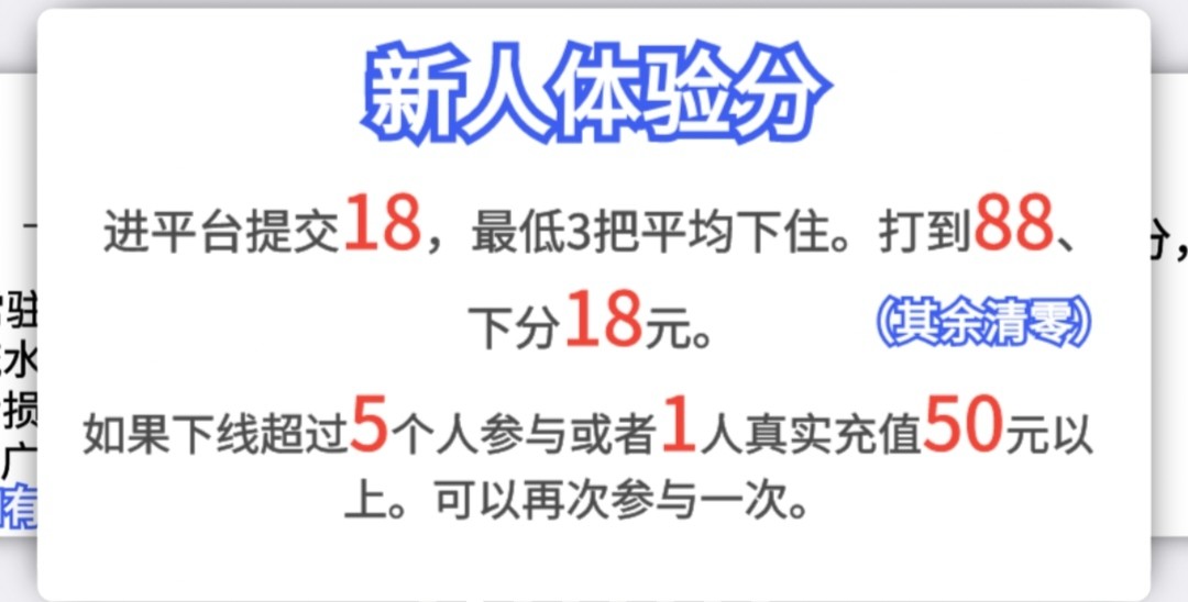 去充值那里,选择体验金通道提交18,打到88下分18